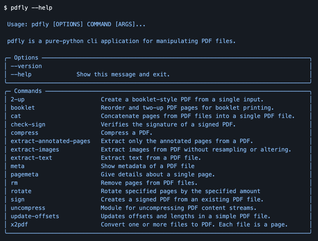 然后输入 pdfly --help 就能看到这个开源命令行工具支持的能力。