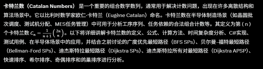 3. 与最短路径算法的结合卡特兰数可与之前讨论的最短路径算法(BFS SPs、Bellman-Ford SPs、Dijkstra SPs、Dijkstra APSP)结合,优化半导体场景中的计数和路径分析。2. C#实现卡特兰数以下是 C# 实现的卡特兰数,支持直接公式(乘法公式)和动态规划两种方法,适用于半导体场景中的计数问题。4. 与排序算法的结合与对比卡特兰数可与快速排序、希尔排序、奇偶排序