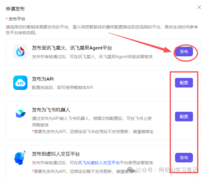 点击已经创建的智能体,发布即可。