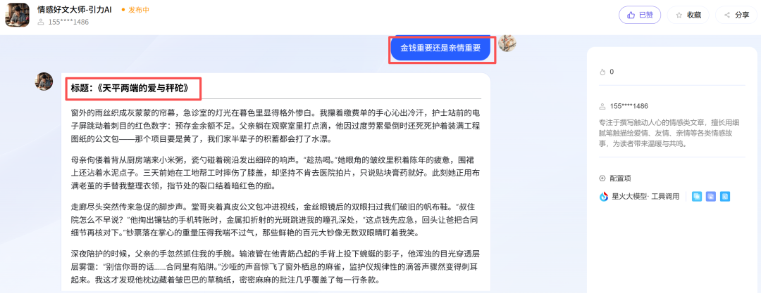接下来就可以使用了。点击进入对话页面。我们可以测试一下,比如在对话框输入:金钱重要还是亲情重要。