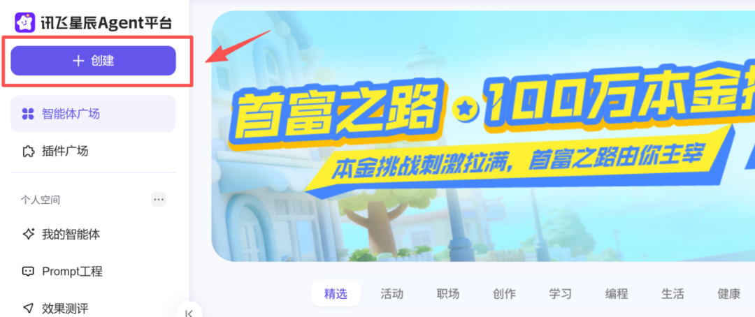 ①打开讯飞星辰Agent,点击创建
