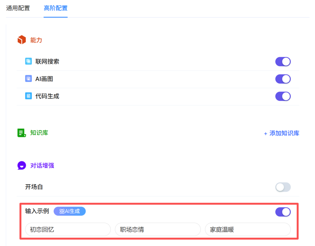 还有高阶配置板块,在这里可以进一步设置细节,比如加上输入示例,引导客户产生需求等等。