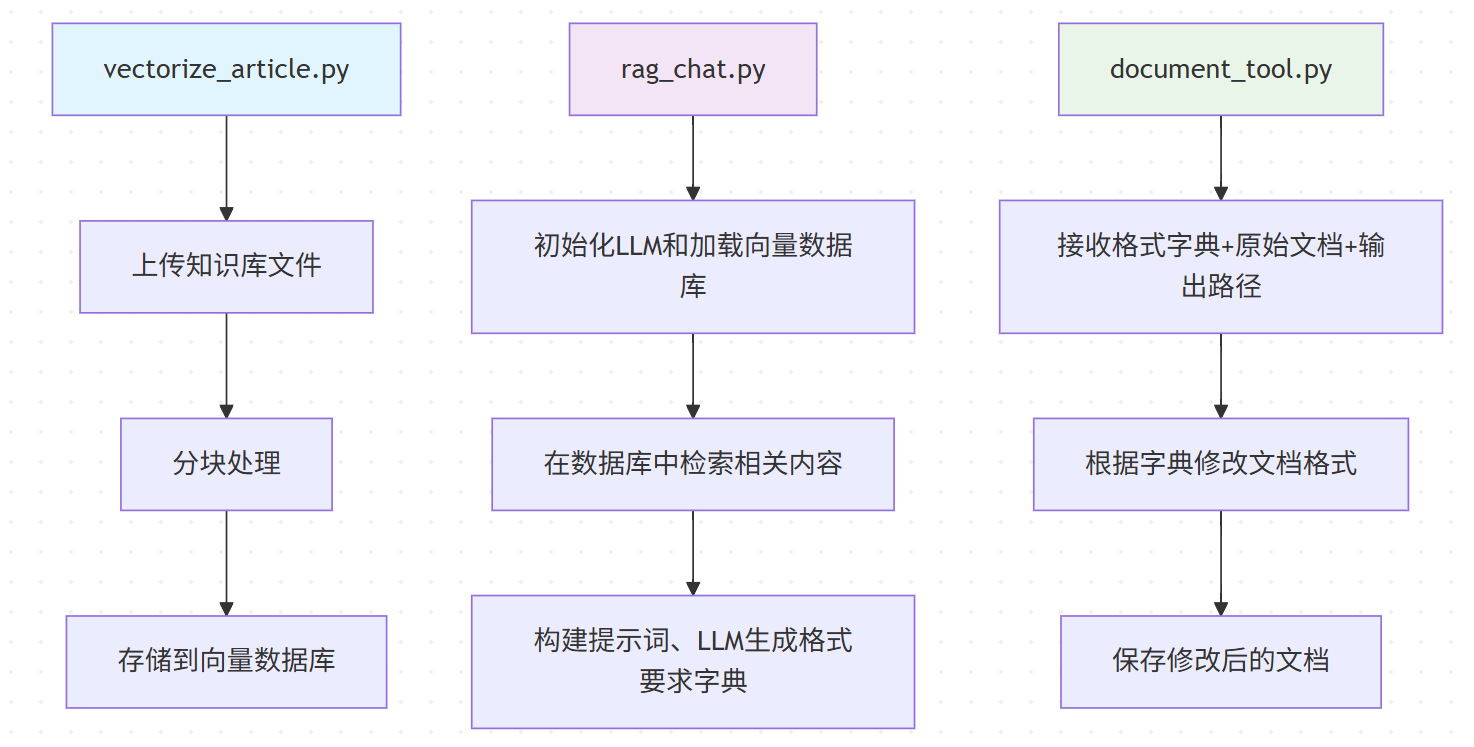 项目十分简单,可以延申到其他复杂的项目,项目逻辑如下:项目演示:问题:根据开题报告的要求,修改example.docx的格式。AI根据知识库查询到开题报告的详细格式,再修改文档。