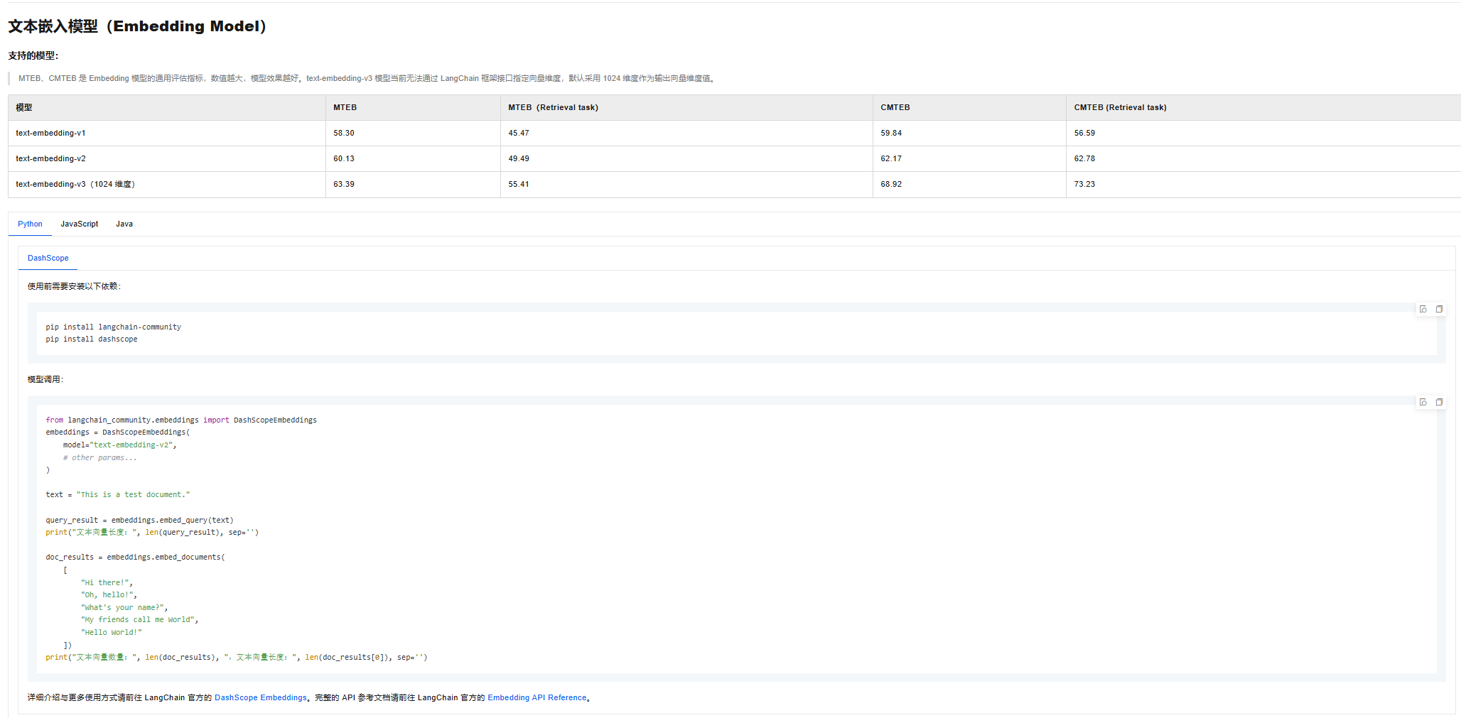 得到的list[str]需要用 嵌入模型 来向量化,得到的如[‘-12312.123...','123.333..']向量化的数据,我用的是阿里的模型,模型介绍如下,注意阿里的是DashScopeEmbeddings而不是OPENAI的,否则报错: