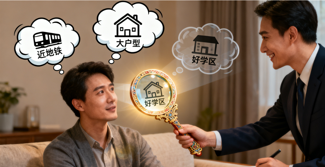 - 核心诉求优先级模板:“如果现在有三套房源:A 套‘近地铁(步行 5 分钟),但户型是两居改三居,卧室较小’;B 套‘户型方正(三居全明),但距离地铁 1.5 公里’;C 套‘近学校(步行 3 分钟),但房龄比前两套老 5 年’,您会优先排除哪一套?或者说,这三个因素里,您最不能妥协的是哪一个?”