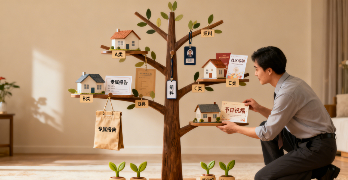 - C 类客户:3 年以上成交、较少联系(如仅节日问候),维护频率 “每季度 1 次线下互动 + 每 2 个月 1 次线上互动”。线下:上门送 “实用小礼品”(如定制钥匙扣、家用工具箱);线上:发送 “长期价值内容”(如 “房产保值技巧”“装修翻新攻略”)、“节日专属祝福”(附手写贺卡照片)。