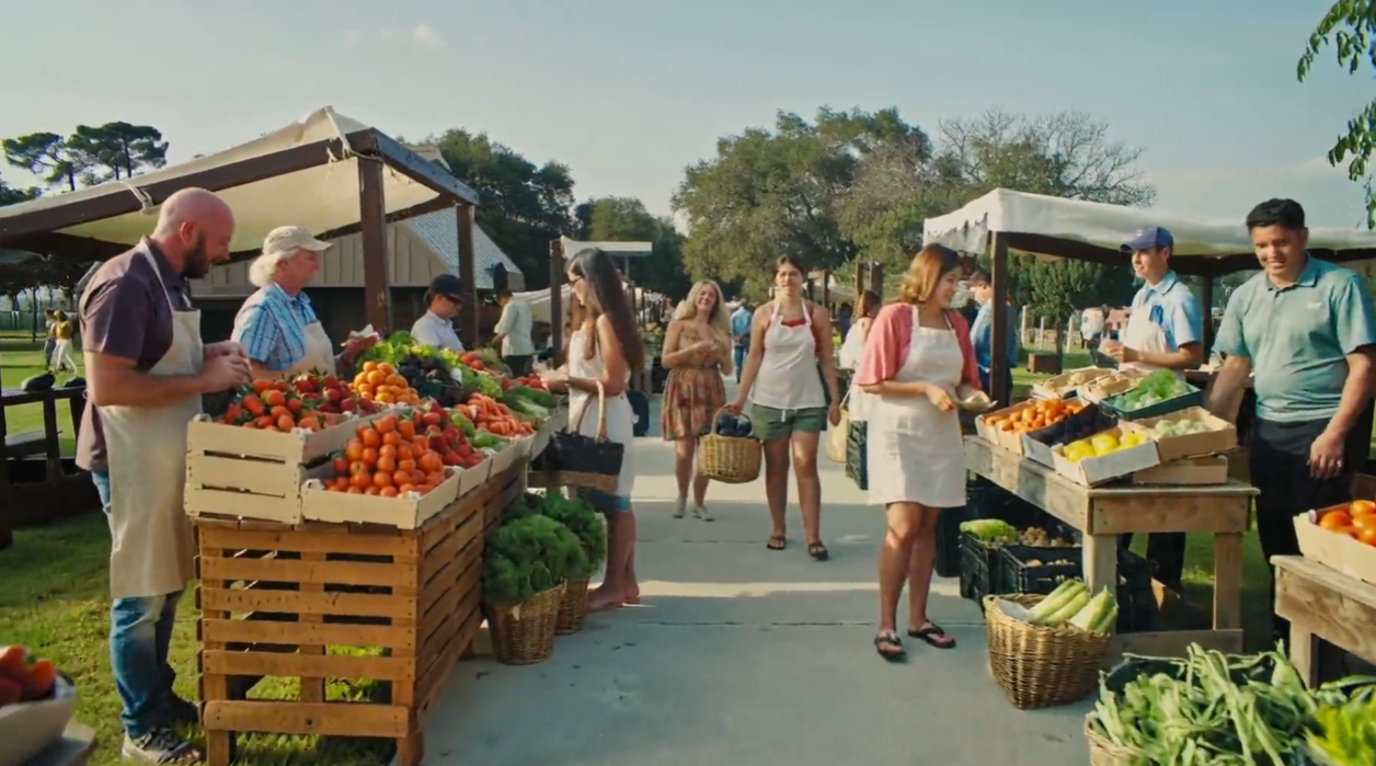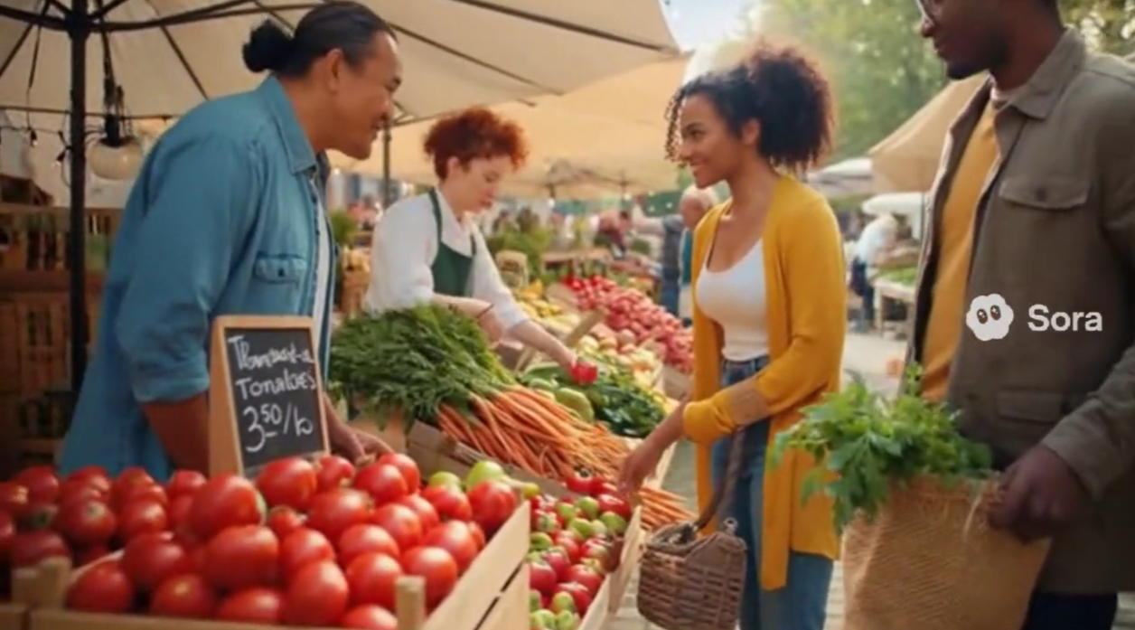 Prompt4:商贩在热闹的农贸市场摆摊,展示新鲜的水果和蔬菜,人们漫步其中,挑选农产品并享受这充满活力的氛围。