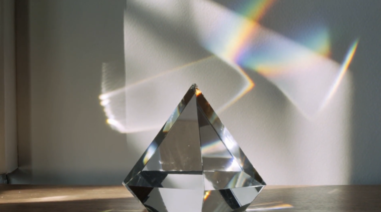 Prompt9:阳光穿过水晶棱镜,在白色墙壁上形成绚丽的彩虹色光斑。