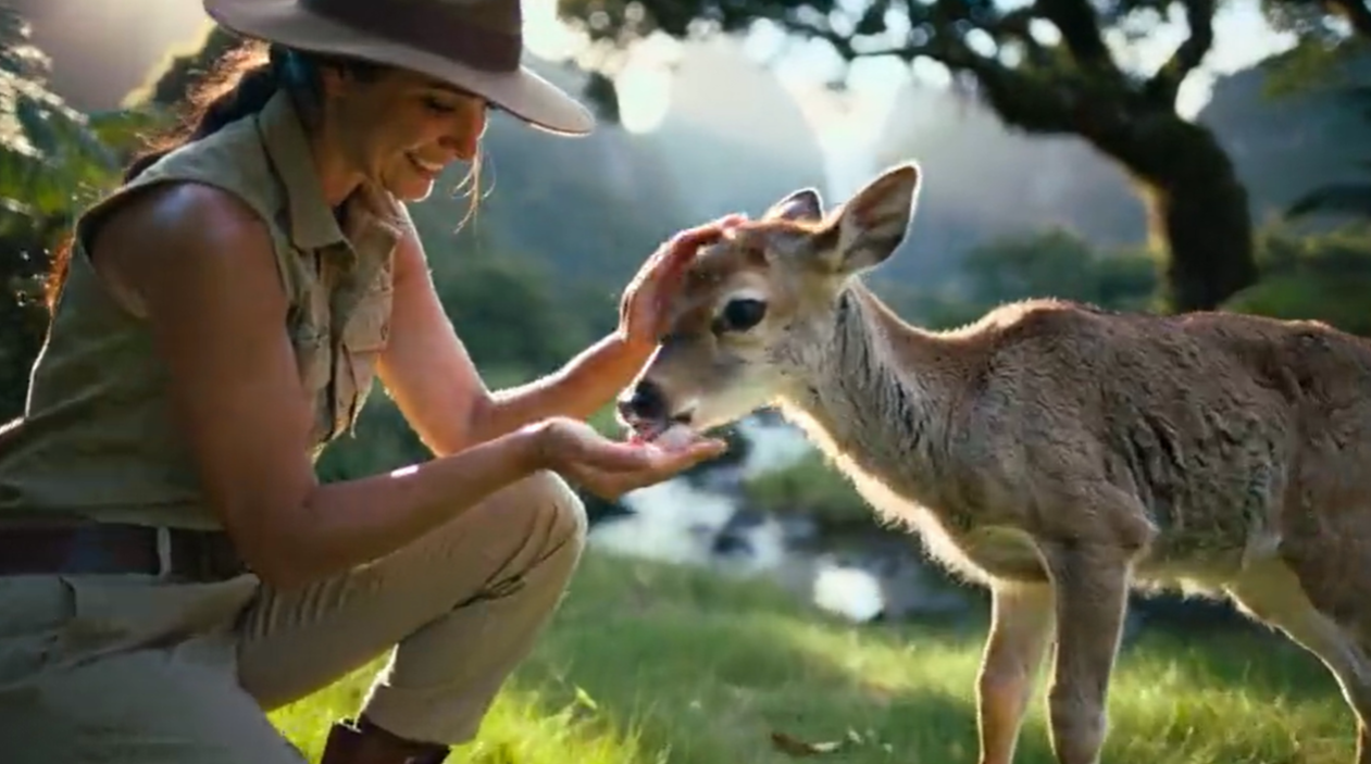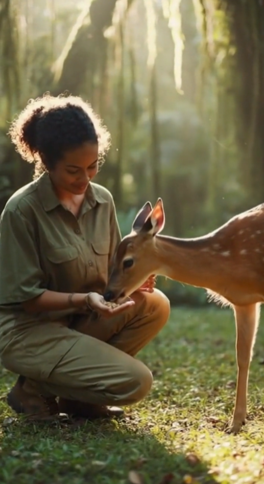 Prompt12:保护动物的公益广告,丛林里,一位年轻的女性动物保护员蹲下身喂养身边的一只瘦弱的小鹿,小鹿伸出细嫩的舌头舔食。保护员微笑着轻抚小鹿柔软的毛发,阳光洒在草地上,投下斑驳光影,画面充满关爱和温暖。
