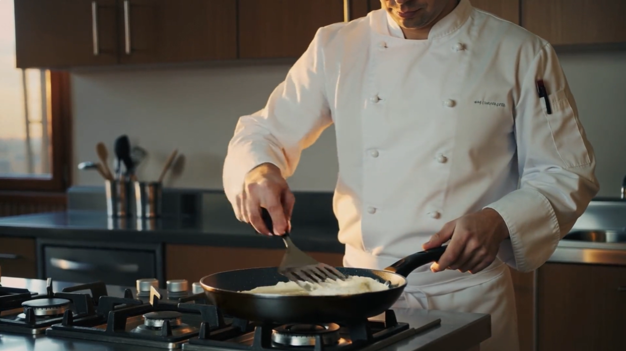 Prompt10:一位厨师翻动煎饼,在上面放上奶油。