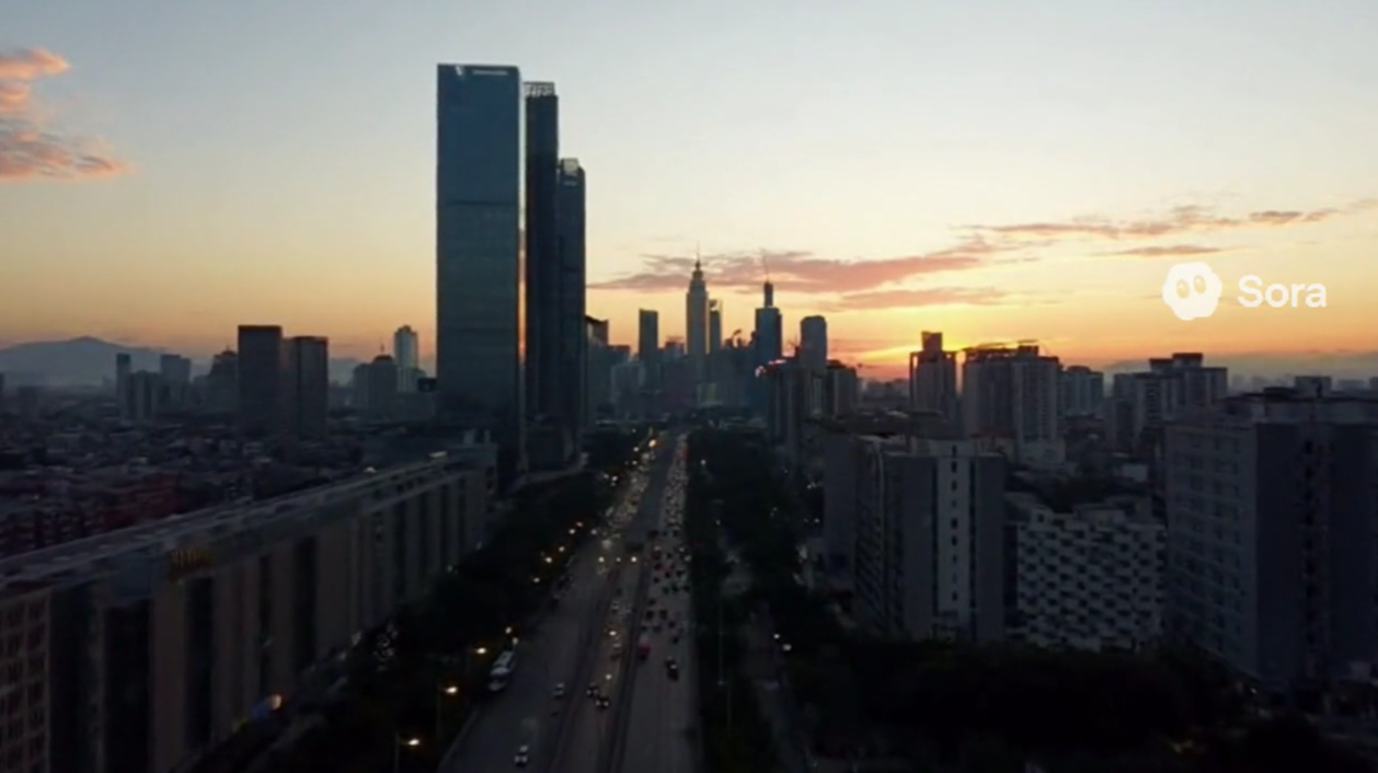 视觉质量:可灵2.5Turbo>Sora2。画质上,可灵2.5Turbo远好于Sora2,Sora2整体视频模糊、看不清视频内容细节;建筑群和车流排列密集且混乱,不符合客观现实,车流动态过程呈现出非常扭曲、粘黏的状态。相比之下可灵2.5Turbo视频清晰度高、细节展现明确,建筑和车流都能看出较为规则的形态,但也存在远景的汽车排列密集、粘黏、道路线条不规则的问题。