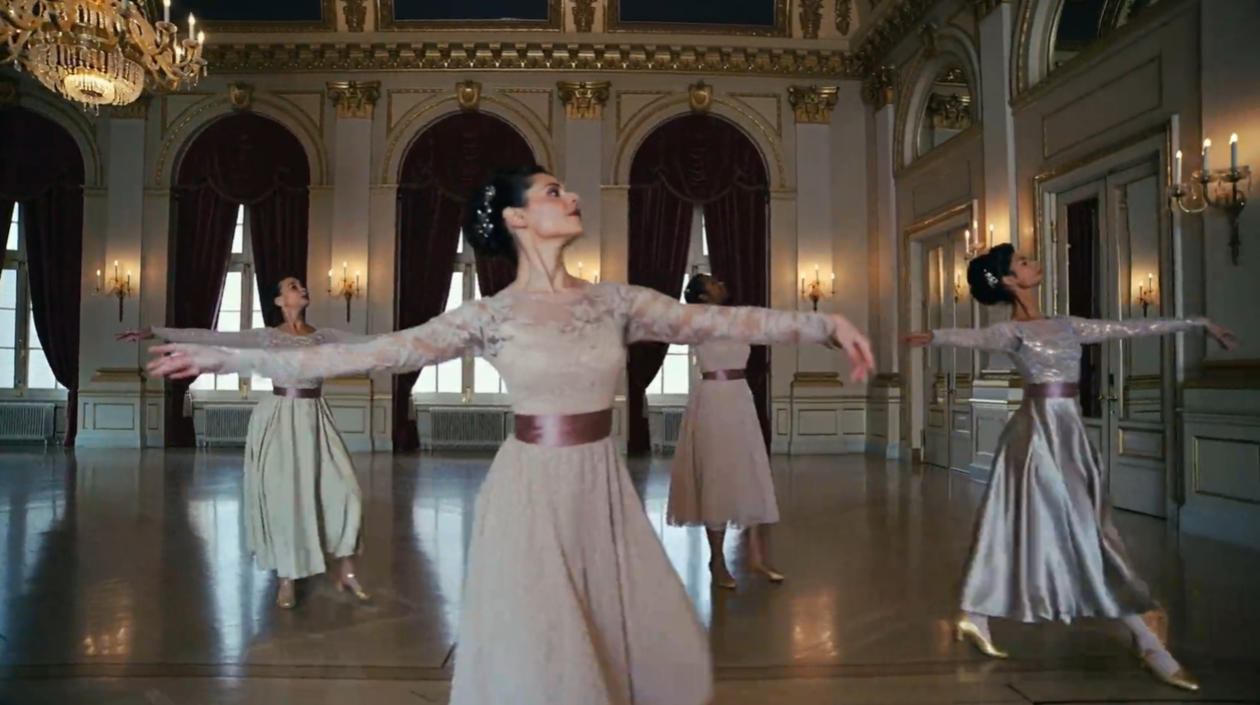 Prompt7:身着优雅舞服的舞者们在大舞厅抛光地板上轻盈滑行,他们的动作与音乐同步,在闪烁枝形吊灯下旋转摇摆。