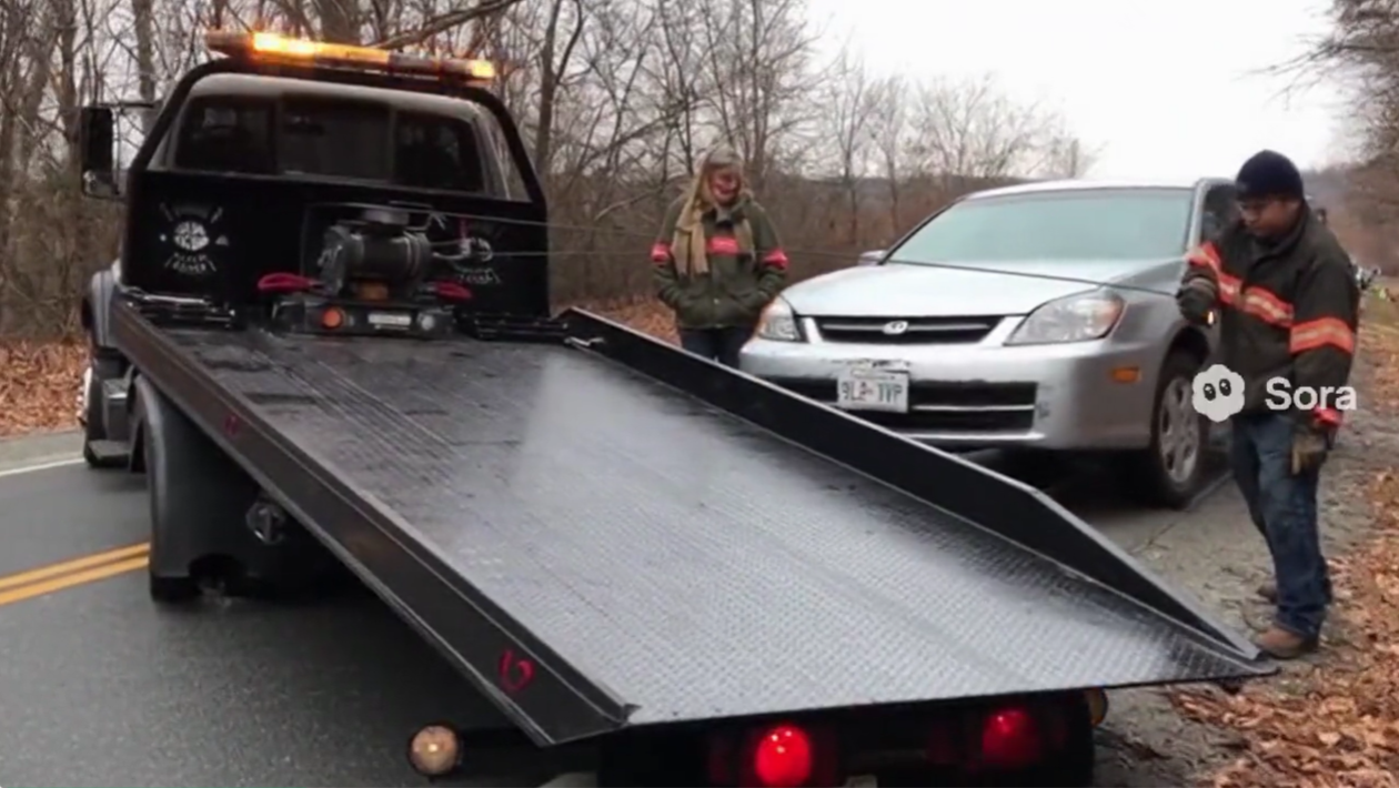- 一致性:可灵2.5Turbo>Sora2。Sora2没有完成“将抛锚的汽车拖上平台”的要求;可灵2.5Turbo展现出了已经拖上拖车的场景。