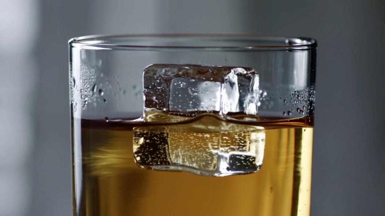 Prompt8:一块冰块被放入温热的饮料中,缓慢融化,在液体中泛起轻柔的涟漪,逐渐改变着它的形态。