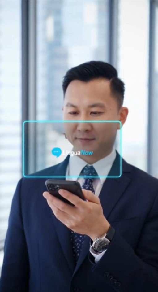 Prompt13:翻译软件广告,一个商务风打扮的男士对着手机讲话,同时一个实时的音频频谱图出现在手机上空,随后这个频谱图变成中文文字“很高兴与你合作”。