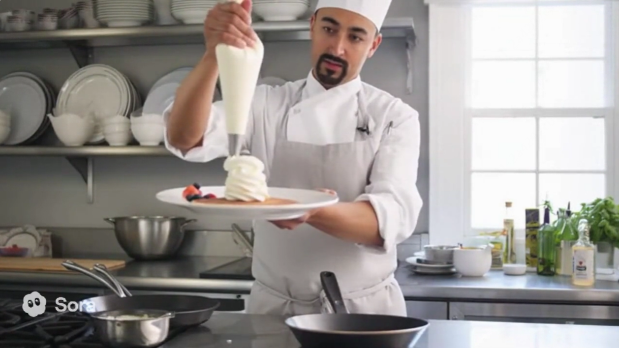 - 视频质量:可灵2.5Turbo=Sora2。Sora2和可灵2.5Turbo的2个视频都逻辑欠佳,Sora2煎饼掉到外面,可灵2.5Turbo凭空抹上奶油。