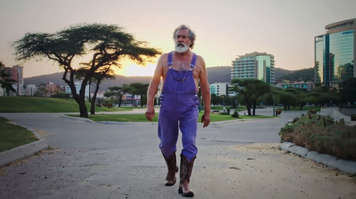 Prompt5:一位穿着紫色背带裤和牛仔靴的老人,在南非约翰内斯堡美丽的日落时分悠闲地散步
