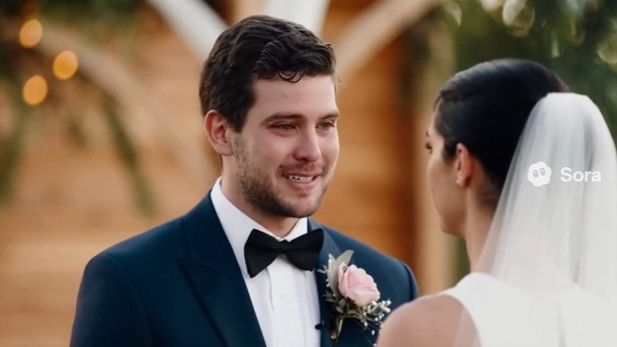 一致性:可灵2.5Turbo>Sora2。Sora2未明确捕捉到新娘的面部表情,可灵2.5Turbo则完整地捕捉了新郎和新娘的的面部表情,并且符合prompt要求的人物特征和情绪。