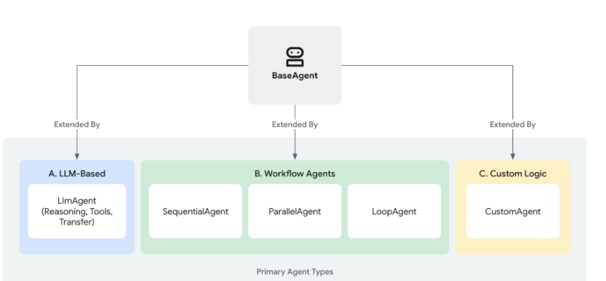 - 自定义 agent:通过直接扩展 BaseAgent 基类创建,开发者可自由实现特殊业务逻辑、定制控制流或集成非标系统,满足高度个性化的需求。