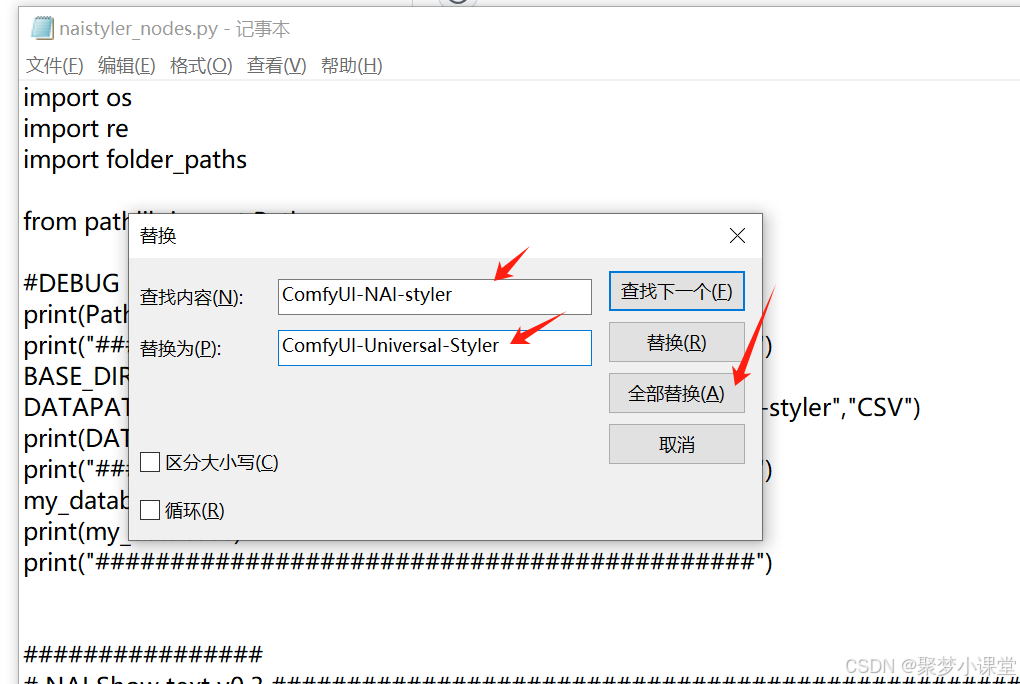 查找 ComfyUI-NAI-styler ,替换为 ComfyUI-Universal-Styler,全部替换,记得保存文件。