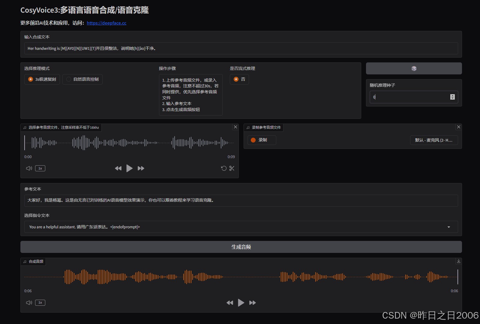 自然语言控制:上传参考音频,输入需要合成的文字内容,支持喜怒哀乐等多种情感控制,支持十几种中文地方方言,“选择指令文本”可快捷下拉选择,最后生成。