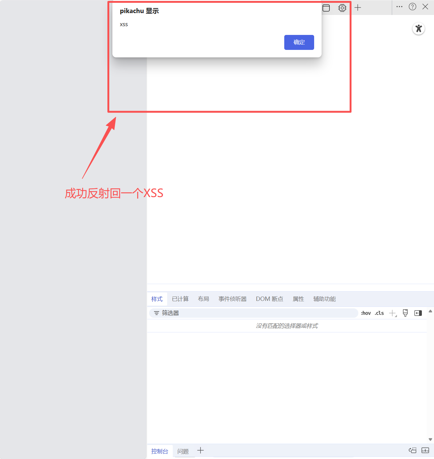 成功反射回一个XSS,这也是为什么会把这种基于文本环境的上下文叫做反射型XSS的原因,我们插入的内容只是一串文本弹窗,不需要我们手动构造闭合。
