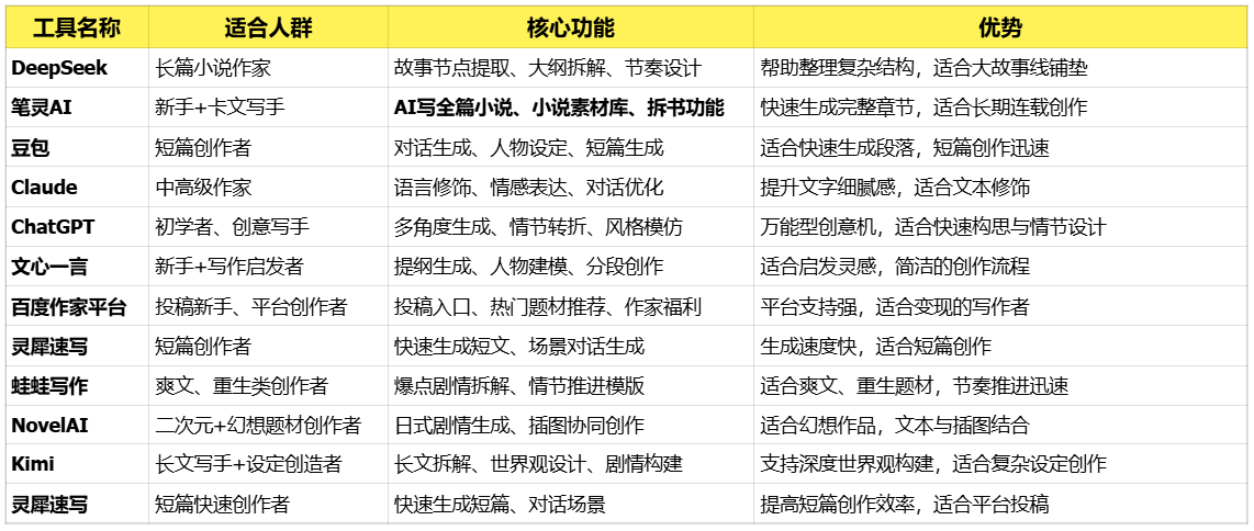 为了帮助大家快速找到最适合自己的AI写小说软件,下面我做了一个对比图表,列出了每个工具的核心功能、适配人群以及优缺点,方便大家在选择时参考。