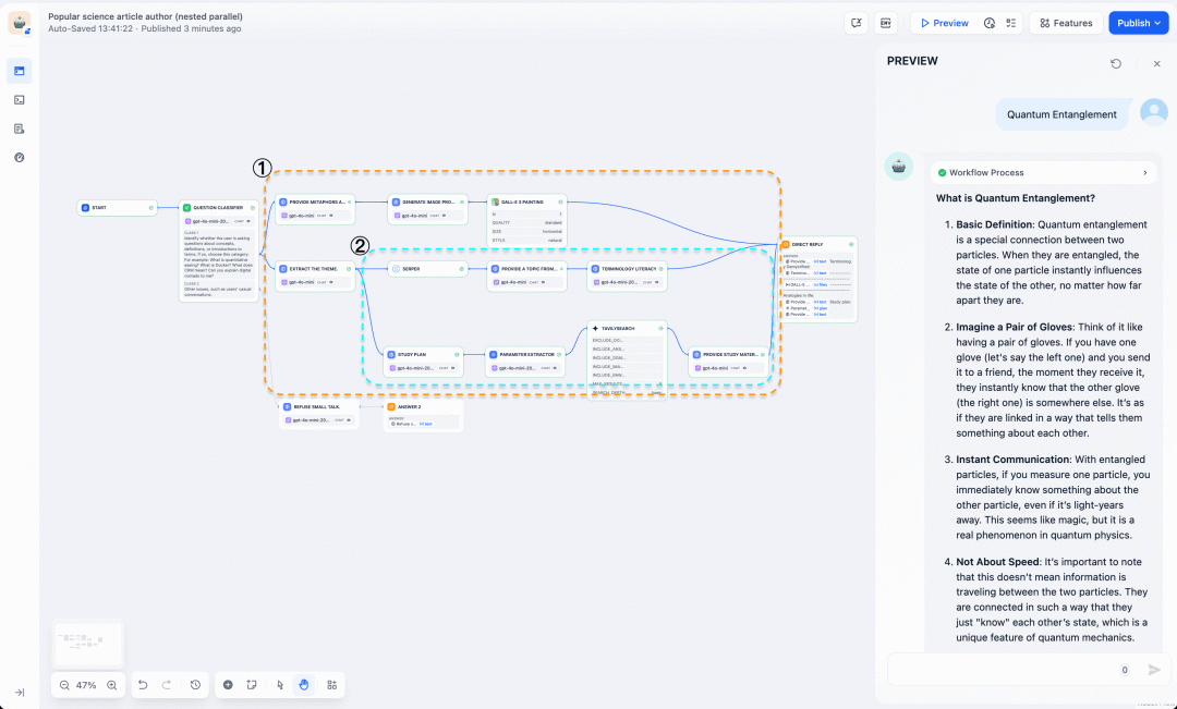 允许在工作流中实现多层级并行结构。从初始节点开始,工作流分支出多个并行路径,每个路径包含各自的并行流程。“科学写作助手”示例展示了两个嵌套层级: