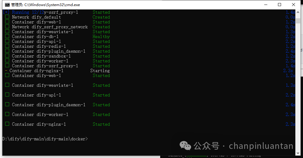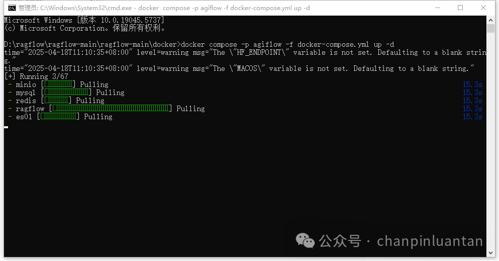 不要用官方给的命令安装(docker compose -f docker-compose.yml up -d),因为安装后容器名称默认为docker,且如果再使用官方的命令安装Dify,会和RAGFlow共用一个容器,不易区分,因此需要重新设置容器名称