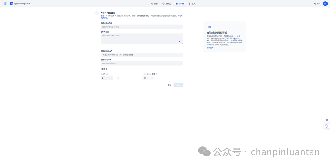 2、任意填写外部知识库名称、知识库描述