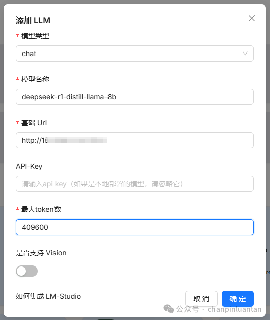 启动LMStudio并加载一个本地模型-开启在局域网内提供服务-在RAGFlow中按图示添加