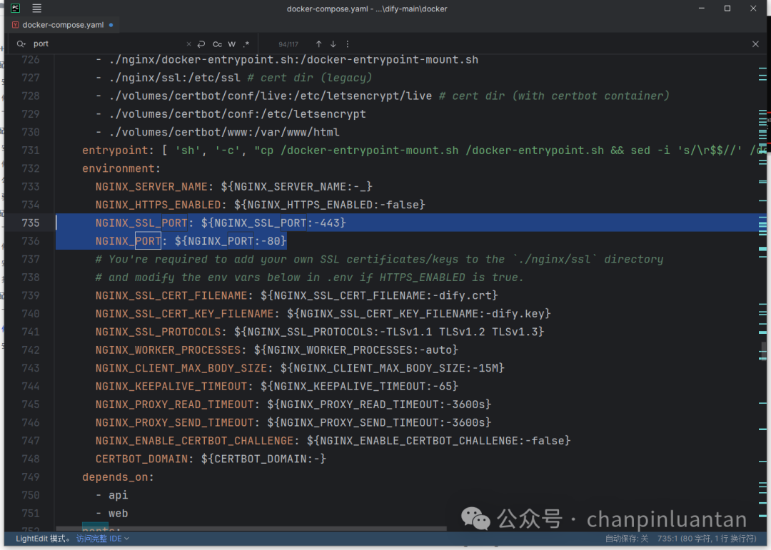 (2)打开.env和将docker-compose.yaml文件,将所有的EXPOSE_NGINX_PORT=80改为5201,EXPOSE_NGINX_SSL_PORT改为8443,建议选用5001-9999之间的数字