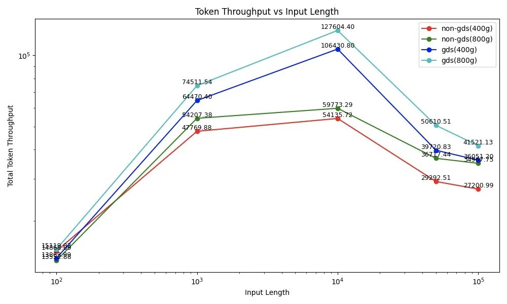 模型的推理性能随网络带宽增加,这个现象在所有输入长度下都呈现正相关的趋势, Throughput 有 9%~29% 的增加。