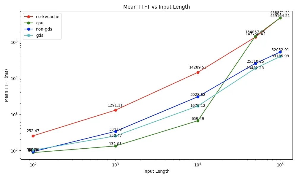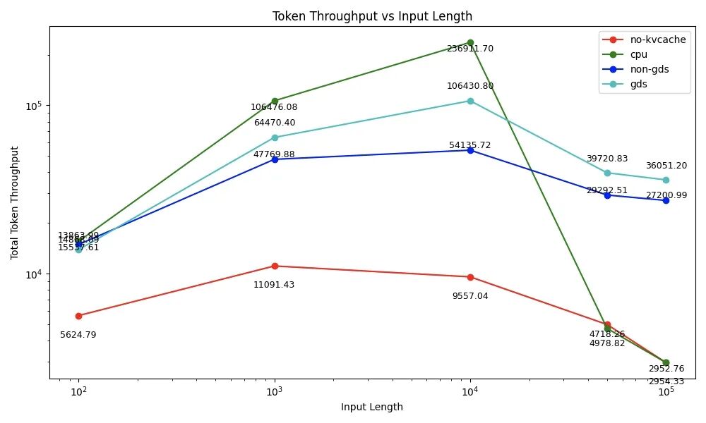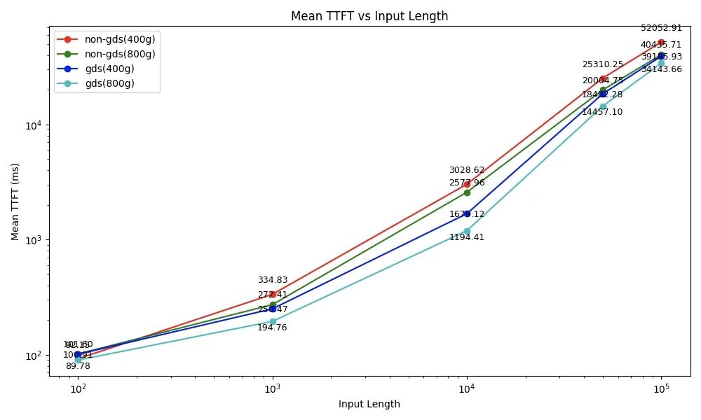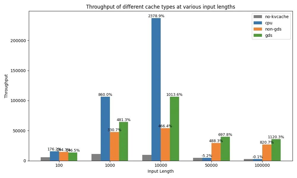在不同后端读写模式的对比中,GDS(GPUDirect Storage)表现最优,相较于Non-GDS模式,在 Throughput 上可提升 32.5%–96.6%。这说明在具备高带宽、低延迟访问路径的网络存储系统中,LMCache 能更充分发挥其异构缓存层的优势。
