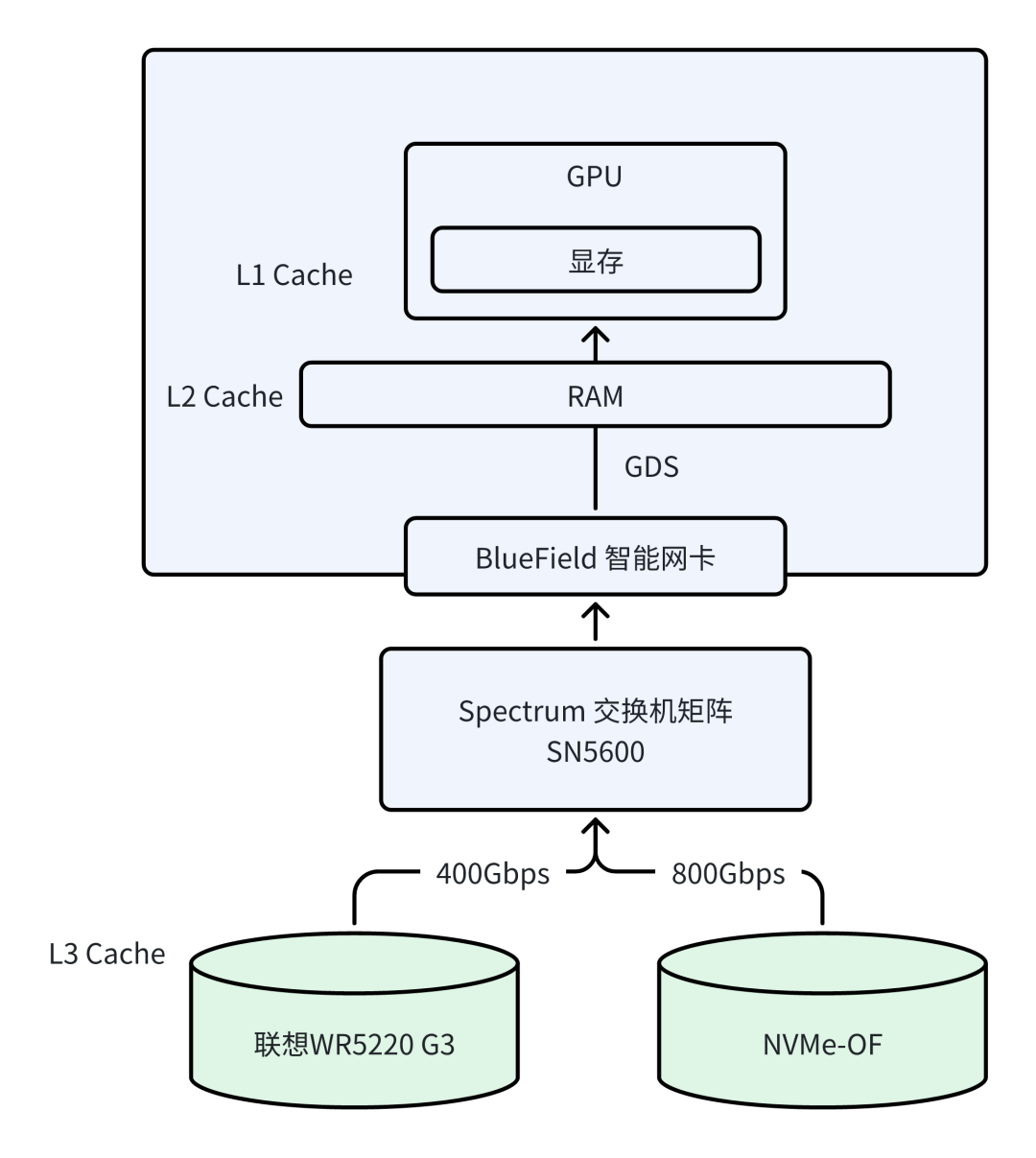 本文的后端存储统一采用高性能的网络存储, 通过 BlueField-3 网卡和 Nvidia GPU 之间实现 GDS 的高速直通, 并利用 Spectrum 交换机在存储和 GPU 机器之间提供稳定和高性能的传输。