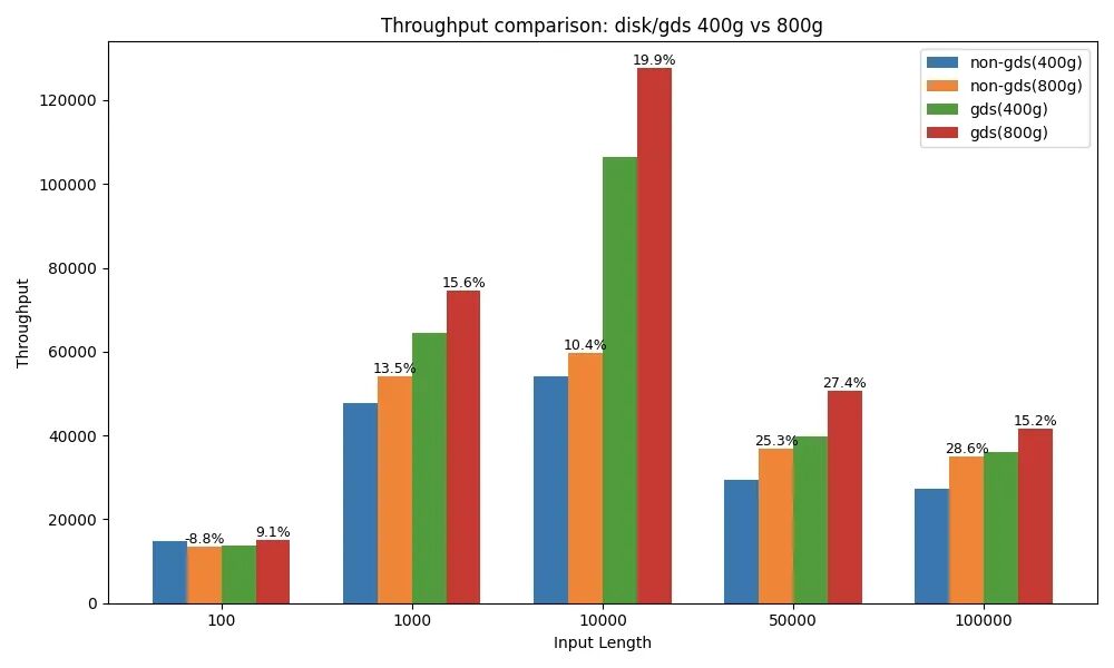 测试结果也显示出 GDS 的存储 IO 模式,效果基本上始终好于“Non-GDS”的模式,相比而言在 Throughput 上有 32.5%~96.6% 的增长。