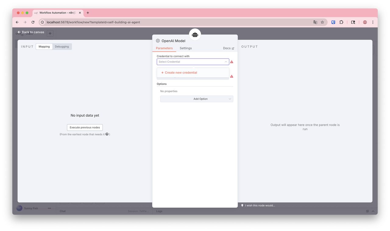 在n8n的工作流中,点击“Test a simple AI Agent example”,会看到报错,不用担心,我们修改一下配置。