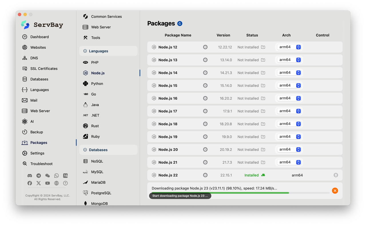 在 Node.js 那里,选择一个合适的 Node.js版本,然后点击下载。ServBay会自动处理下载和设置过程。