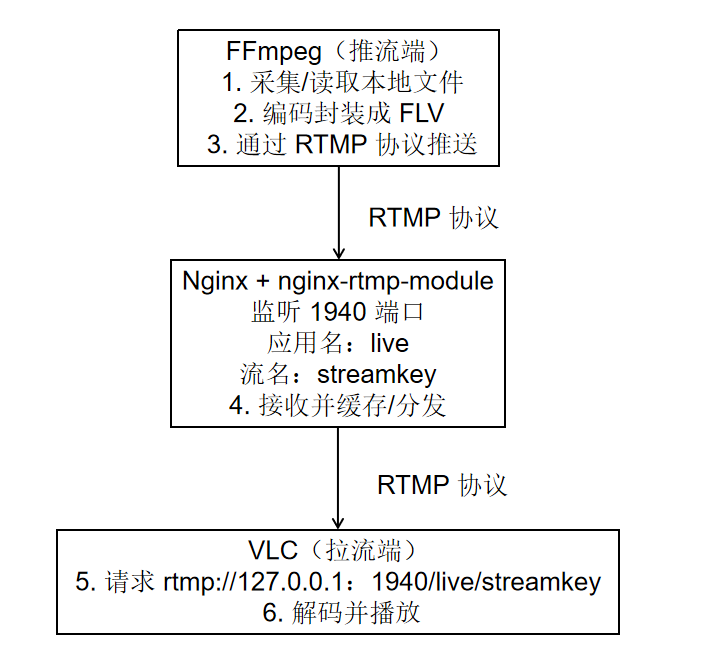 推流地址为 rtmp://<服务器IP>/live/<流名>,拉流地址同样为此地址