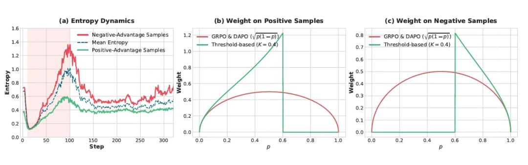 结果清晰地表明,熵的增长主要由负优势样本主导。这揭示了在训练早期,由负优势样本引起的过度探索,以及后期利用不足的问题。