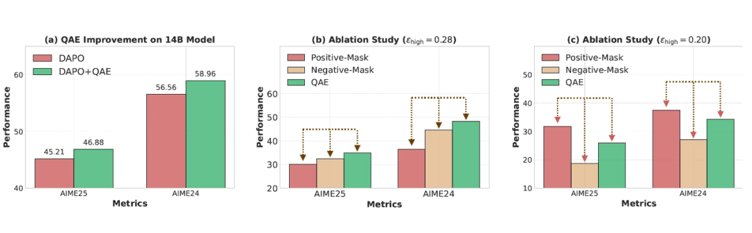 pass@1 提升、pass@16 基本不变:如图 5(a)所示,DAPO 在约 100 步后 pass@1 停滞,而 QAE 持续提升,表明样本利用效率更高。