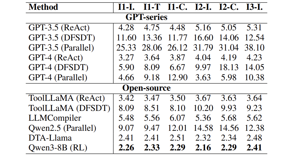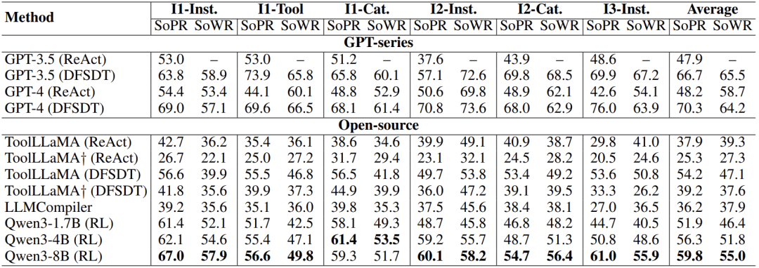 - 效果:Qwen3-8B在StableToolBench上平均SoPR达59.8%,超过GPT-4(ReAct)的48.2%。