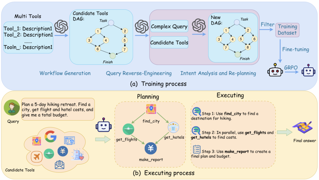 本文提出了一种全新的思路:将“规划”与“执行”分离,引入一个专门的“规划器”(Planner),负责在任务开始前就制定出一个全局执行计划,这个计划以“有向无环图”(DAG)的形式呈现,清晰标出工具之间的依赖关系。此外,作者还构建了一个大规模基准数据集ComplexTool-Plan,并设计了一套两阶段训练方法(SFT + GRPO),显著提升了模型在复杂任务中的表现。实验表明,该框架在多个基准测试中达到最先进水平,同时执行效率更高。