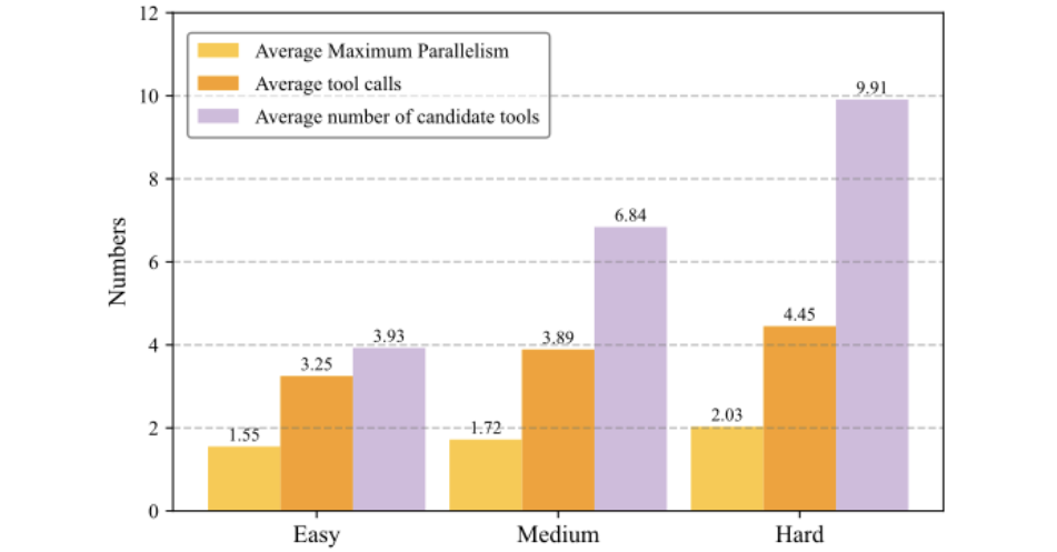 - ComplexTool-Plan:包含4,535个工具API,任务分为Easy/Medium/Hard三个难度级别。Hard任务工具选择更多,依赖更复杂。