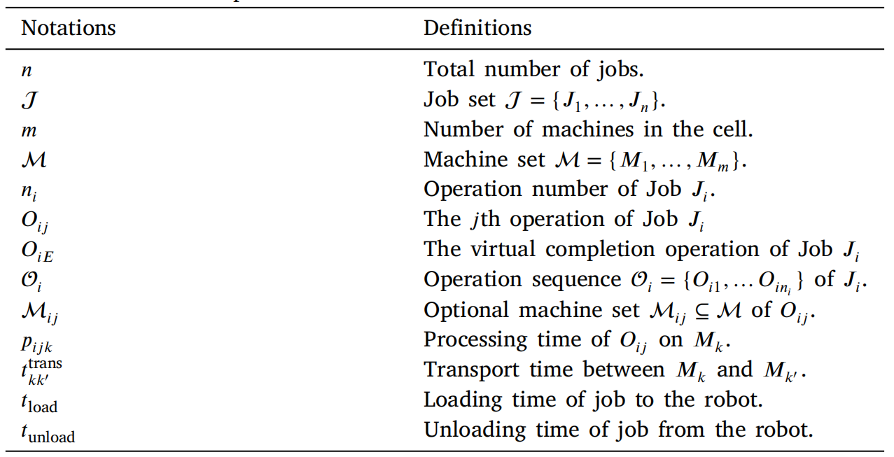 一个柔性机器人单元由输入站、输出站、机器和一个运输机器人组成。一组包含n个工件的集合J={J1,...,Jn}J=\{J_{1},..., J_{n}\}J={J1,...,Jn}将在具有mmm台机器的机器集合MMM上进行加工。每个作业Ji∈JJ_{i} \in JJi∈J将从输入站进入单元,然后经过一系列固定的工序Oi={Oi1,...,Oini}O_{i}=\{O_{i1},..., O_{i n_{i}}\}Oi={Oi1,...,Oini},最终从输出站离开单元。每个操作OijO_{i j}Oij可以由一组可选机器MijM_{i j}Mij执行,相应的加工时间为pijkp_{i j k}pijk,其中Mk∈MijM_{k} \in M_{i j}Mk∈Mij。