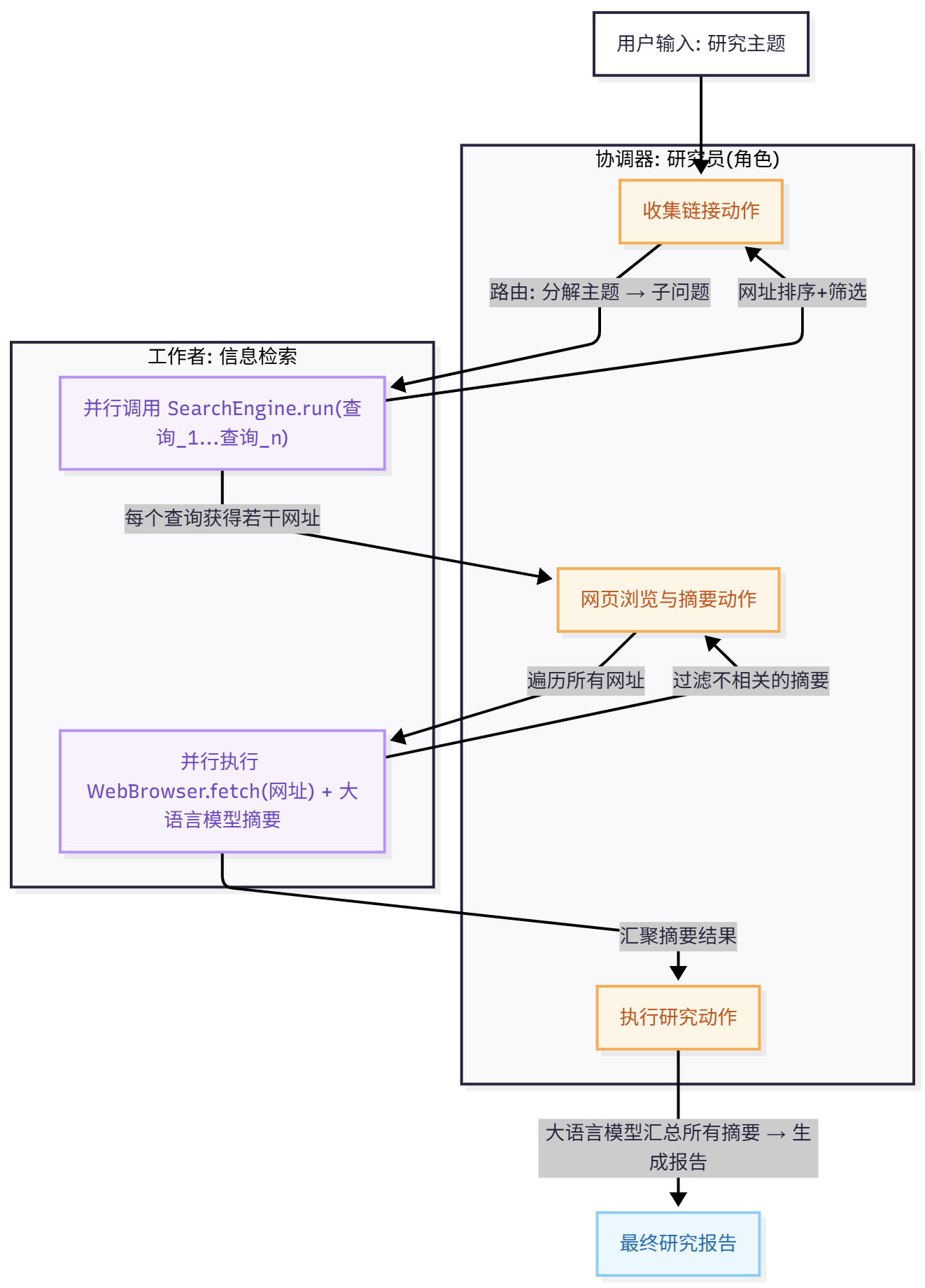 这指的是一个“协调者”角色负责调度、分配任务,若干“工作者”角色执行子任务。虽然这个实现不是明确拆成多个 agent 协作,但结构上也体现了类似的逻辑:Researcher 角色(协调者) + 多个 Actions(工作者)承担不同子任务。