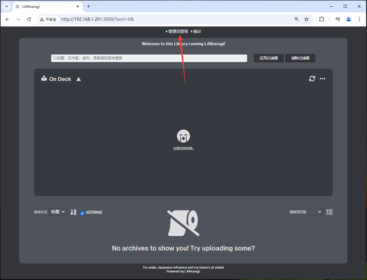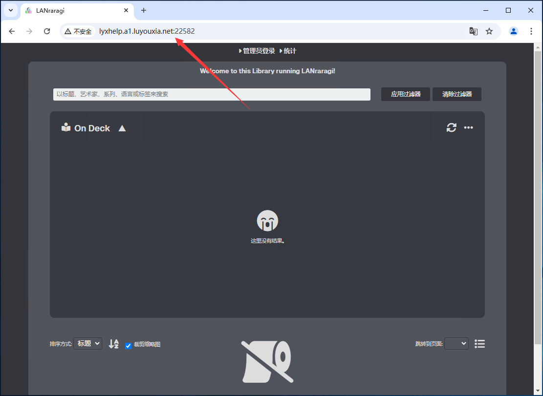 12,在外网的浏览器的地址栏输入复制的外网地址就可以看到本地部署的 Lanraragi 界面了。