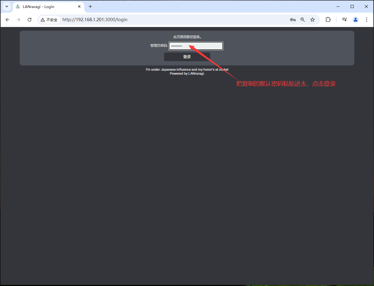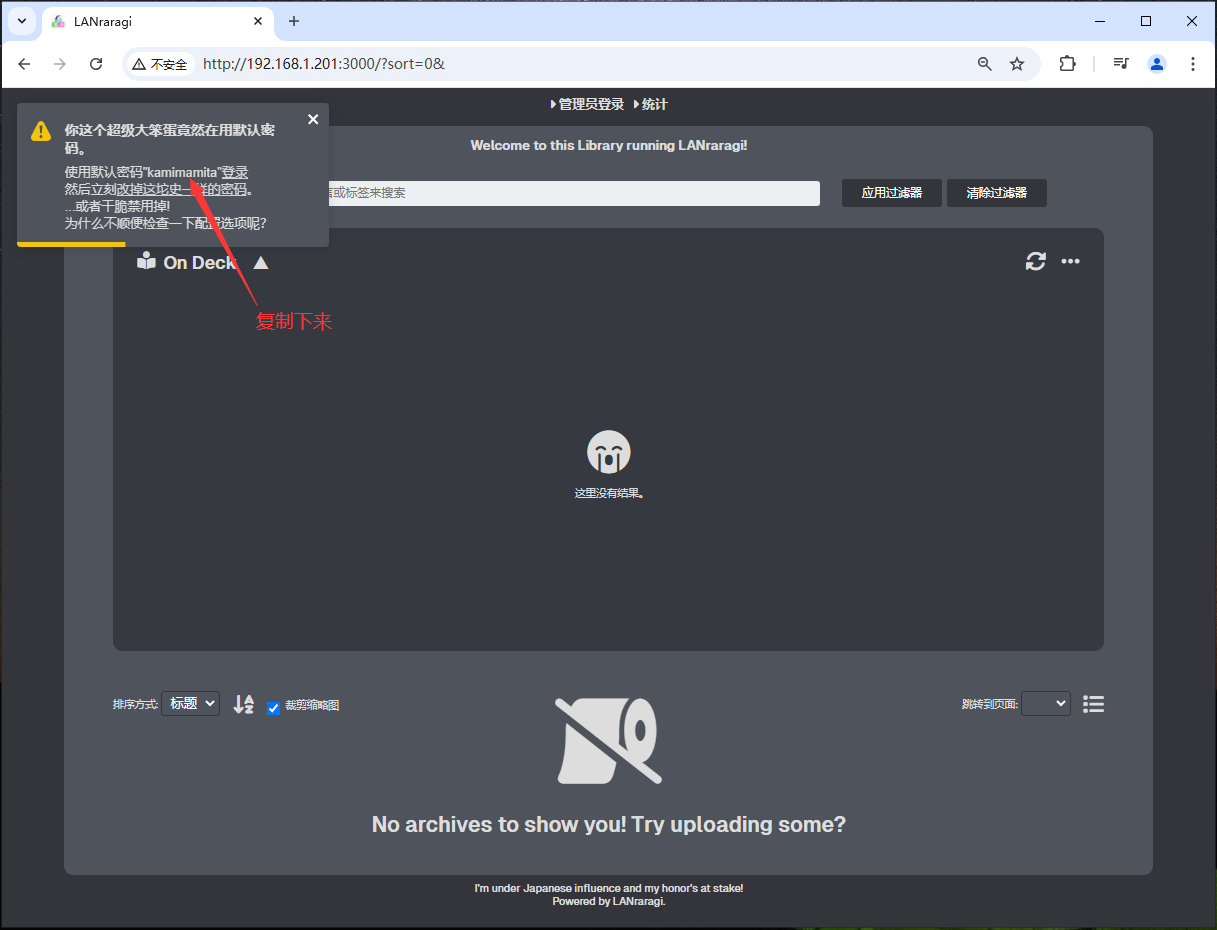 5,在浏览器输入 http://本地IP:3000,就可以看到 Lanraragi 界面了。先复制左上角的默认密码。