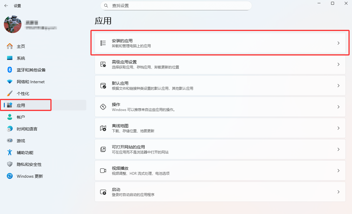 在 Windows 设置中,找到 “应用” → “安装的应用”