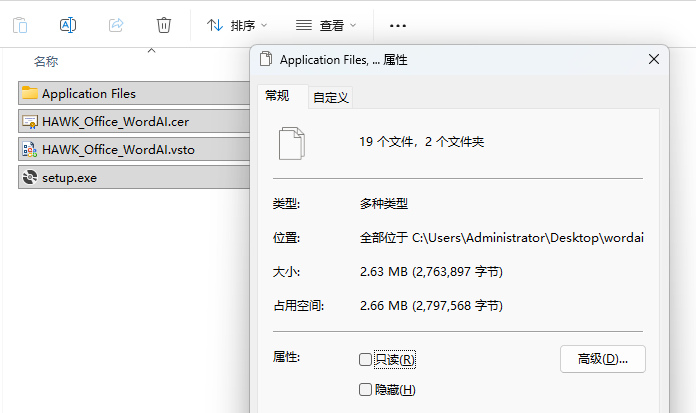 Application Files(程序文件夹)HAWK_Certificate.cer(安全证书)HAWK_Office_WordAI.vsto(核心插件)setup.exe(安装启动器)